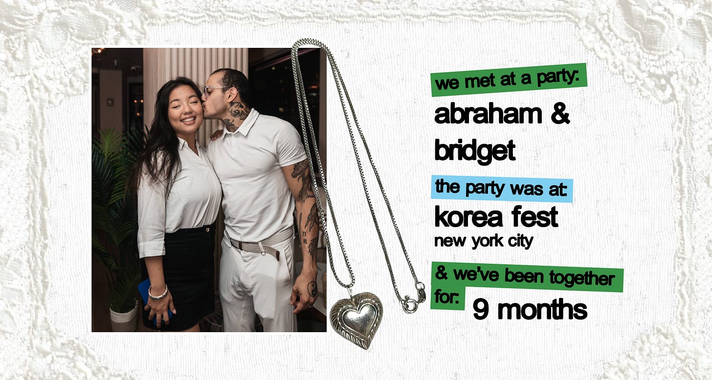 When Abraham hosted his second party, DJing for Korea Fest, he spotted Bridget’s name on the RSVP list again. They talked more this time, between his sets, and discovered they went to the same gym at Chelsea Piers where Abraham taught gymnastics classes.