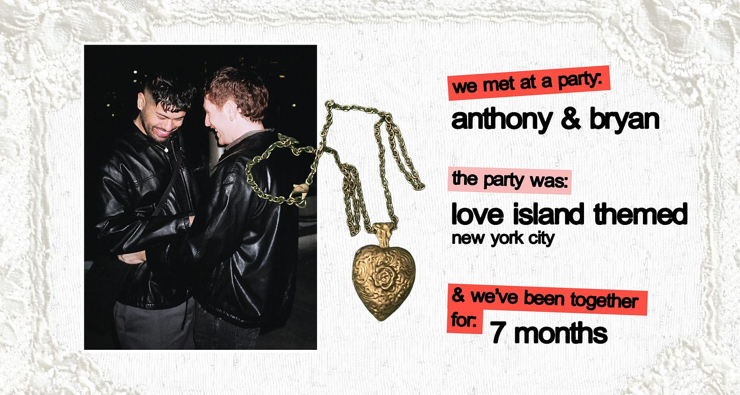 Bryan and his friends had a reputation for themed parties - pajama birthdays, a Barbie-Q, an ‘80s prom, a wedding - and in August 2024, Love Island. Bryan dressed as Rob Rausch in overalls with a fake snake tattoo, and the apartment glowed with neon lights, fake tropical plants, and hot-pink inflatable chairs. Anthony arrived that night as a coworker’s plus-one.