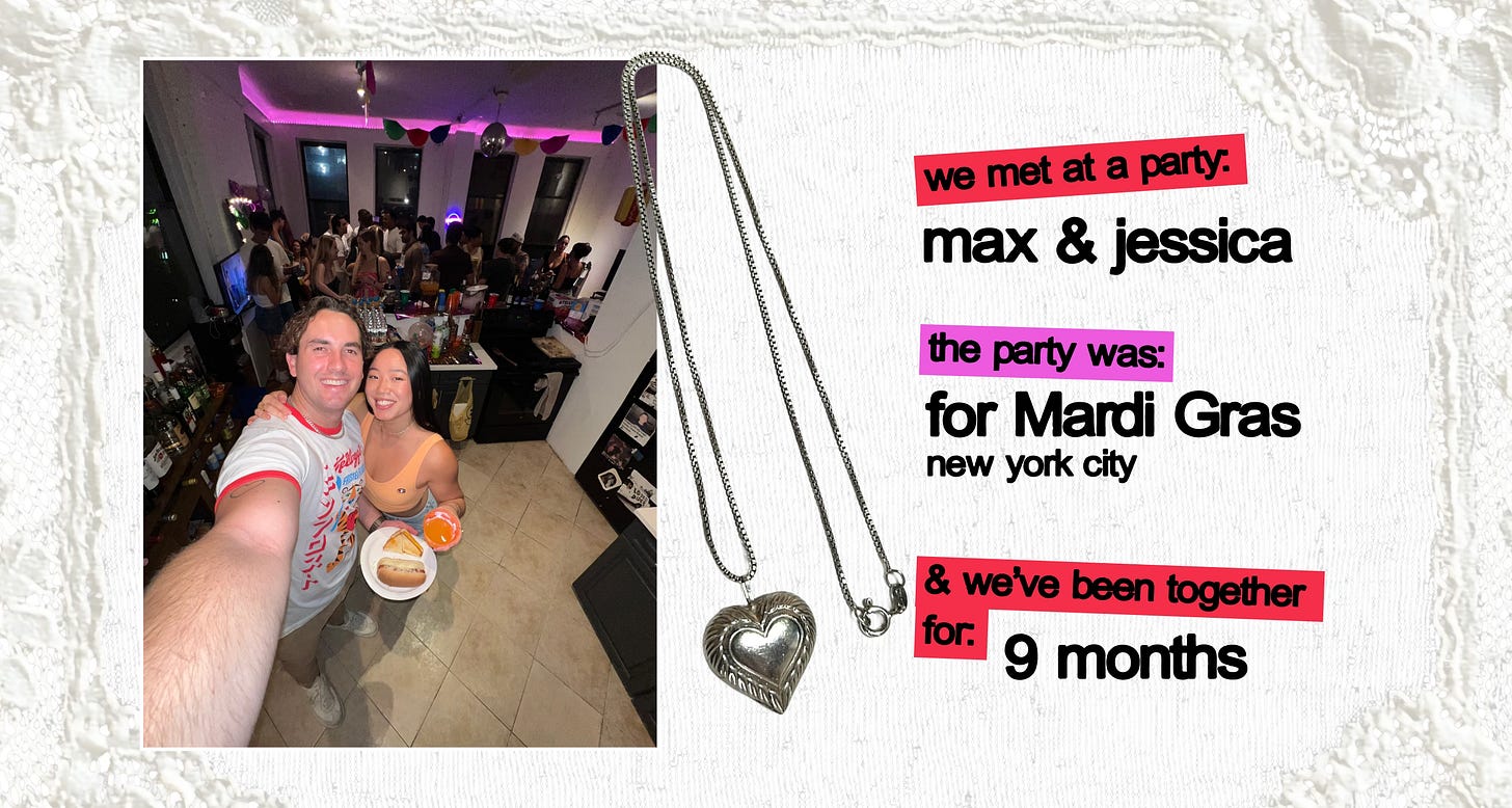 Max first spotted Jessica at Bloomingdale’s and walked up to say hi, but he couldn’t tell if she was interested. He was too scared to ask her out directly, so he invited her to his New Year’s Eve party instead.