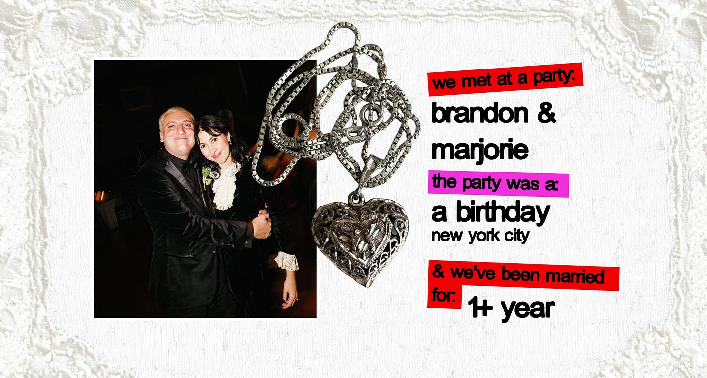 Brandon didn’t know many people at the party. It was a mutual friend’s birthday in New York, and both he and Marjorie had been invited on Partiful. He was scanning the room when he spotted her wearing a shirt that read: Taylor Swift is my wife and we are never getting a divorce.